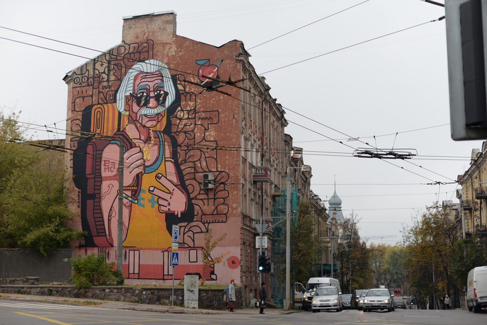 Ir Einšteino atveju viskas apgalvota. Ir fono nėra neatsitiktinai. Norėjau išsaugoti sienos veidą. Mano piešiniai pakankamai ryškūs patys iš savęs, todėl, pavyzdžiui, linijos yra plaukiojančios. Jos veikia išvien su erdve, ne grubiai į ją įsirėžia, bet įsilieja. Aš norėjau visus elementus taip integruoti, kad atrodytų kuo natūraliau, tarsi piešinys ten ir buvo. Pavyzdžiui, šešėliai nuo medžių labai ryškią dieną – jie irgi sukuria formą, kažkokį juodumą užduoda, bet siena persimato. Todėl labai svarbu, kad persimatytų ir šio pastato siena, matytųsi jos tekstūra ir faktūra, taip piešinys išlieka gyvas.